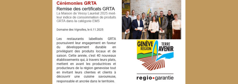 Cette année, l’office cantonal de l’agriculture et de la nature, propriétaire de la marque GRTA, a décerné à La Maison de Vessy et à l’équipe de cuisine le Prix du meilleur indice de consommation de produits GRTA dans la catégorie EMS pour 2025.