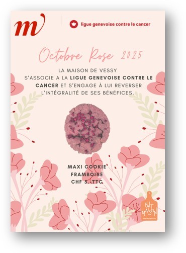 Cette année encore, la Maison de Vessy s’associe à cette campagne de solidarité en proposant tout au long du mois d’octobre son Maxi Cookie, préparé par l’équipe de cuisine pour l’occasion et disponible au restaurant 1234 .