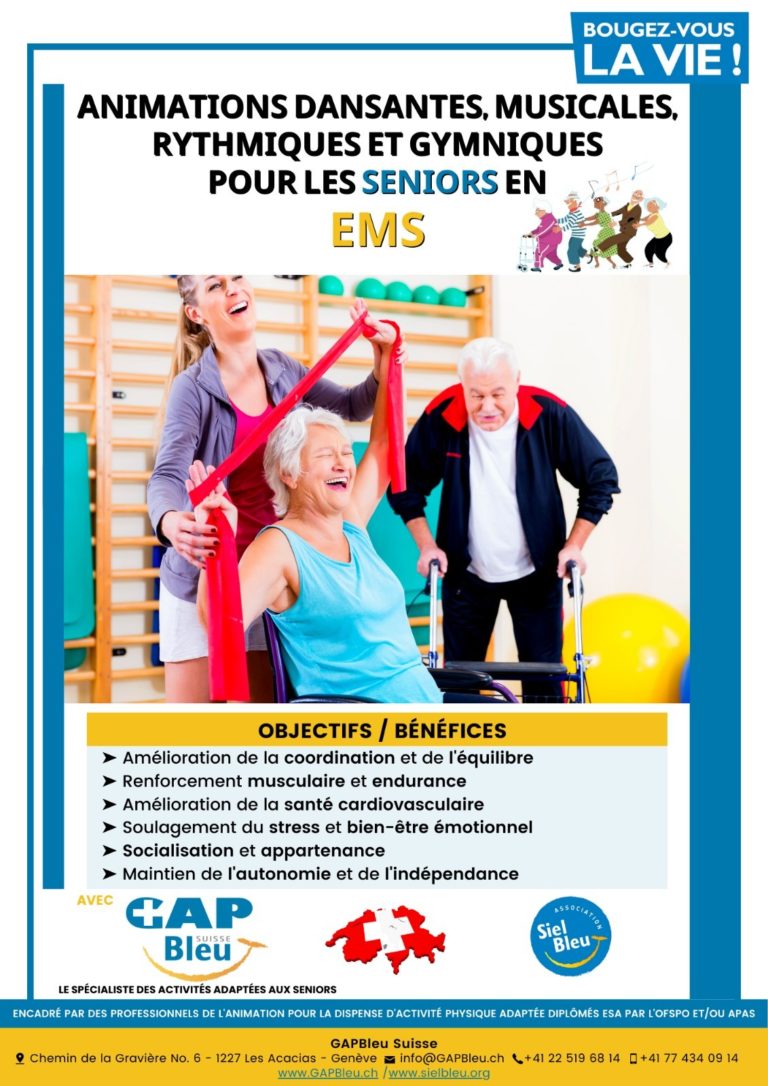Sous l’égide de Pro Senectute, un moniteur spécifiquement formé propose des cours d’activités physiques et sportives adaptées pour promouvoir le maintien de la mobilité.