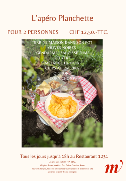 Tous les jours jusqu’à 18h, le restaurant 1234 vous propose son apéro planchette : notre terrine maison servie dans son pot, accompagnée de condiments et de Gruyère. A savourer en terrasse ou dans l’ambiance chaleureuse du restaurant 1234.